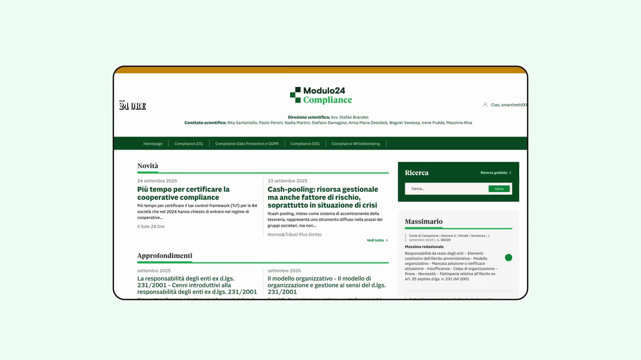 Un servizio di aggiornamento tempestivo su tutte le novità normative e giurisprudenziali su ESG, Data Protection e GDPR, Whistleblowing e 231 grazie alle news quotidiane, le rassegne di giurisprudenza, gli approfondimenti d’autore integrati a strumenti utili per l’azienda ed il legale.