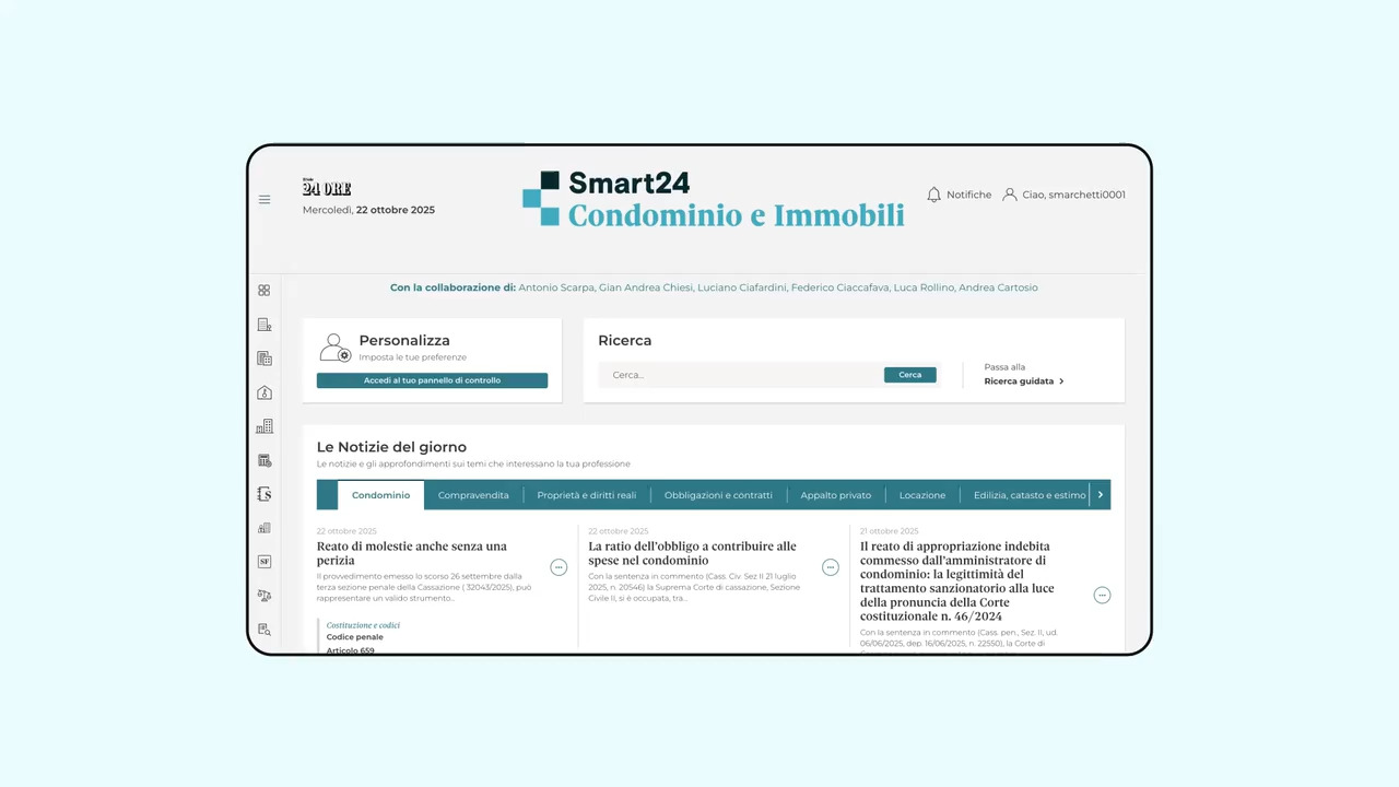 La piattaforma offre un aggiornamento quotidiano sulle novità legislative e giurisprudenziali in materia di condominio, locazione, compravendita, contratti immobiliari, proprietà e diritti reali, appalto privato, distanze tra costruzioni, interventi di recupero e ristrutturazione, efficienza energetica, bonus edilizi e strumenti operativi utili alla professione.