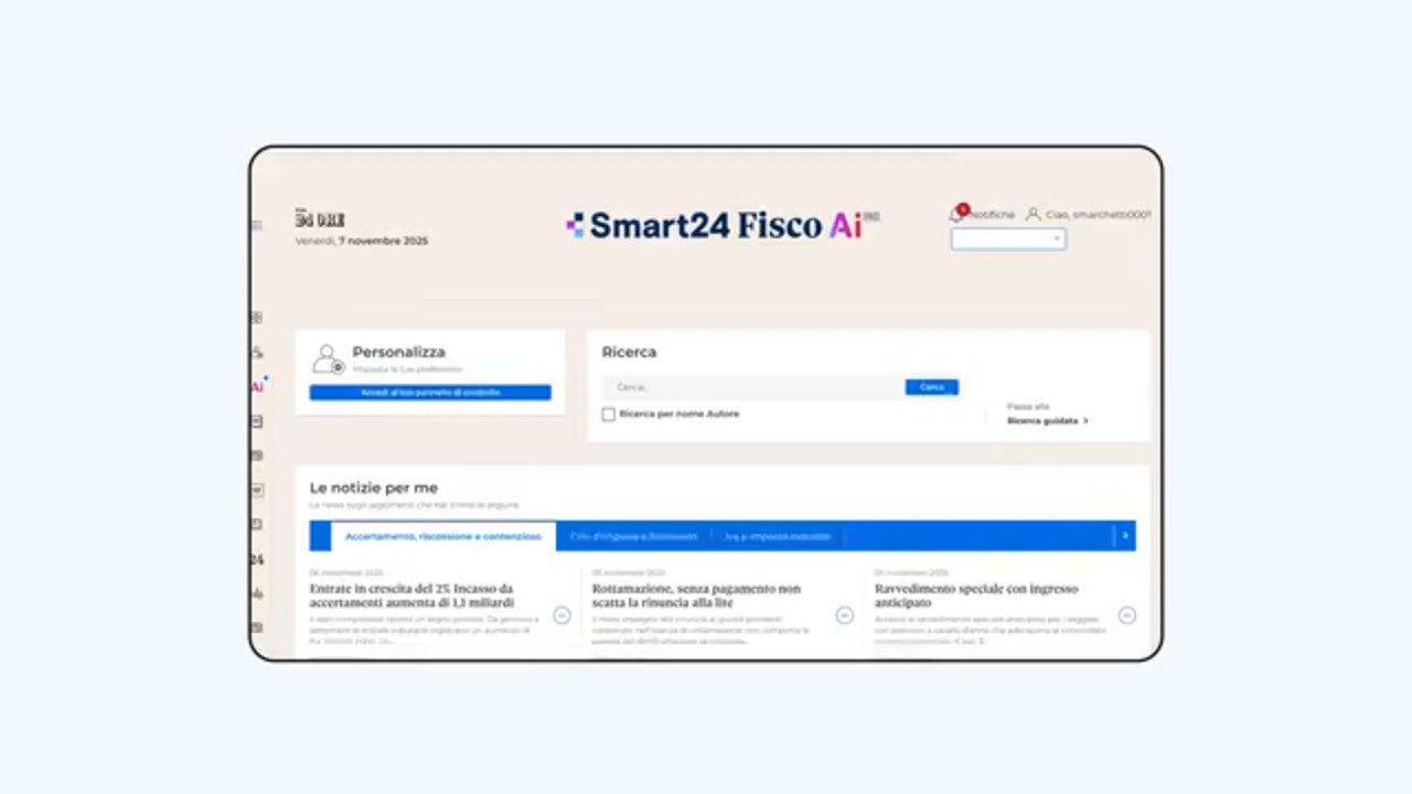 Lo strumento che rende più smart il tuo lavoro. Trova le informazioni che stai cercando in pochi istanti tra tutti i contenuti in materia fiscale, contabile e giuslavoristica del Gruppo 24 ORE. Imposta le tue preferenze e lasciati comodamente aggiornare sui temi più importanti per la tua professione direttamente dalla home page o dalla newsletter personalizzata o ancora dalle notifiche via e-mail. Risolvi i tuoi dubbi con gli Esperti del Sole 24 Ore a tua disposizione per le questioni più complesse. Migliora le tue competenze con la piattaforma e-learning accreditata e aggiorna i tuoi clienti.
